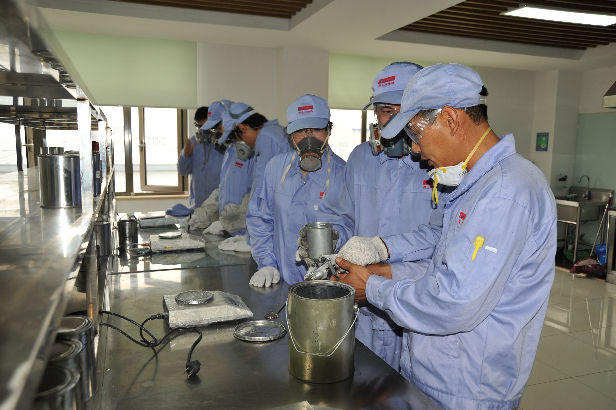 在喷板比赛中,评委从膜厚、板面状态、板面光泽、持枪姿势 喷枪清洁和着装等方面对参赛者进行了严格的评判 在参赛人员完成喷板后,评委对每位选手的喷板进行了专业的审核和评判 通过喷板比赛技术人员提高了技术试验水平,品管人员提高了质量检测能力 生产人员提高了中控能力,技术服务人员提高了业务知识理解能力 从而有效的提升了全公司在涂料领域的专业水准