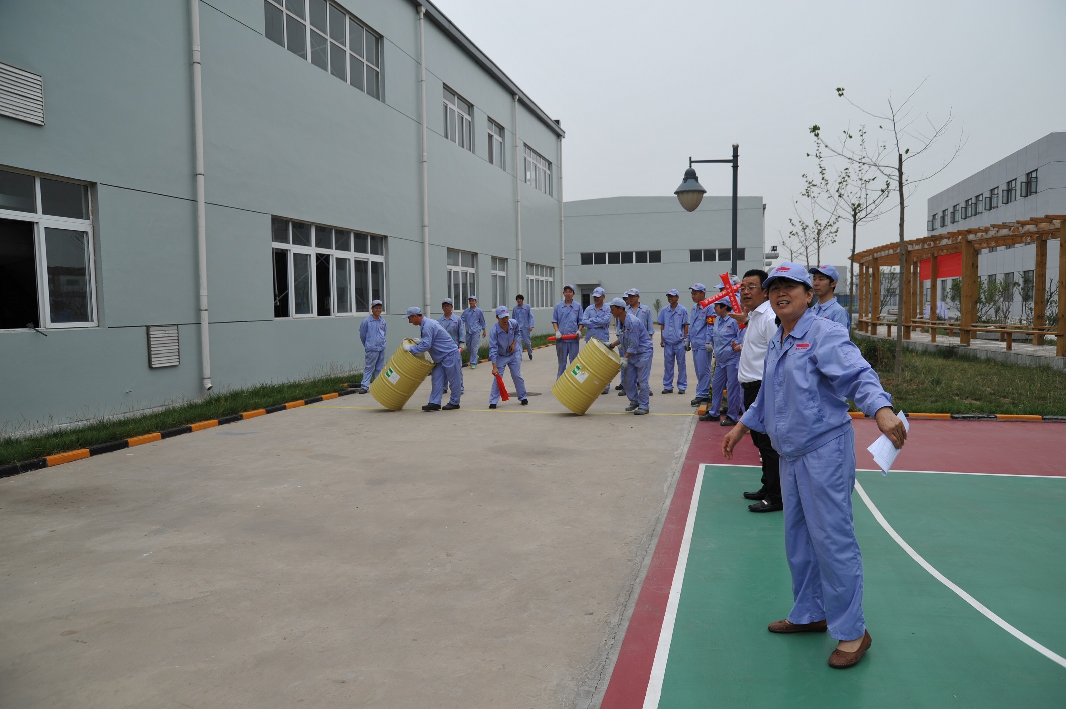 滚筒比赛是为了提高生产能力保证安全生产设计的一项比赛 200L的大桶中承装着相当沉重的原材料,操作人员必须按操作要求完成大桶的运送 当选手滚动着大桶到达终点的时候,大家给予了热烈的掌声